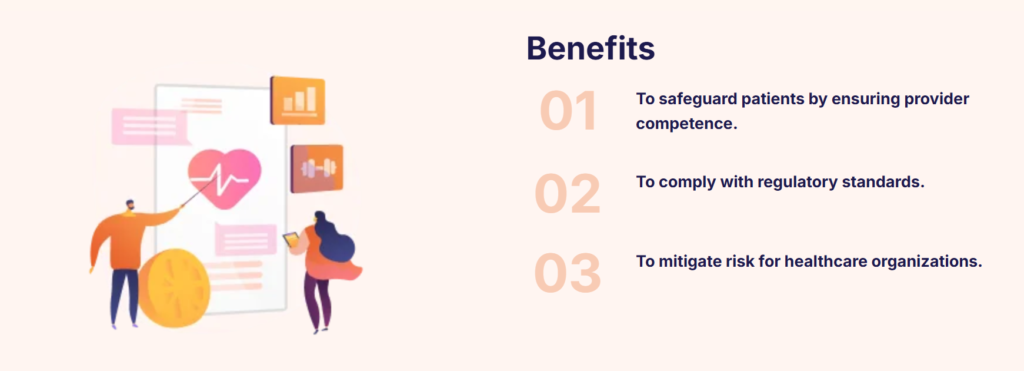 Credentialing: Verification of a healthcare provider’s qualifications, licenses, and background to ensure compliance.