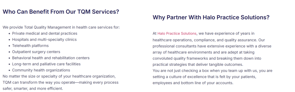In today’s complex healthcare environment, delivering consistent, high-quality care requires more than clinical expertise—it demands a structured, organization-wide approach to quality improvement. At Halo Practice Solutions, we offer specialized expertise in Total Quality Management in Health Care Services, helping healthcare organizations build a culture of continuous improvement, patient safety, and operational efficiency.